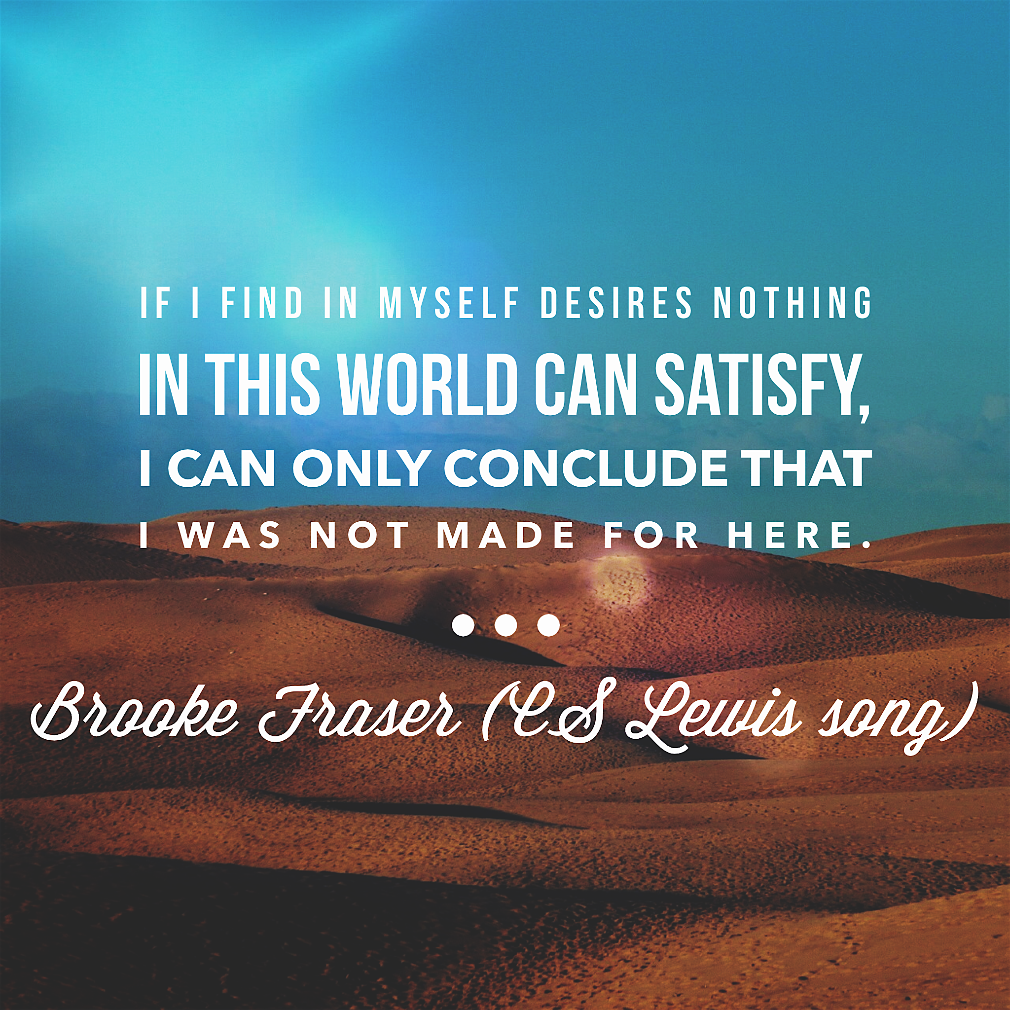 Brooke FraserThere have been times when I’ve felt like I had a bottomless pit. I searched everywhere for something to fill the void, but was unsuccessful. Money, career, relationships, alcohol, experiences nor anything else can fill the space that was created for one, or better yet THE ONE. In the words of Brooke Fraser “If I find in myself desires nothing in this world can satisfy, I can only conclude that I was not made for here.”
