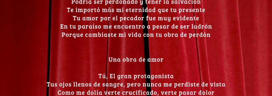 Una obra de misericordia Tú, El gran protagonista Pudiendo condenarme, preferiste ser el pacifista Conmovido por el amor y la misericordia Decidiste marcar mi vida, cambiar mi historia Manos llenas de piedras, listas para condenarme Pero tu mano de misericordia intervino para salvarme Ese día, en el escenario de mi vida Tú, El protagonista, me… Continue reading La Gran Obra