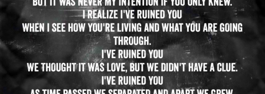 I've ruined you We were limitless, biting off more than we could chew. I've ruined you We got caught up in our dream life, enjoying the view. I've ruined you But it was never my intention if you only knew. I realize I've ruined you When I see how you're living and what you are… Continue reading Ruined