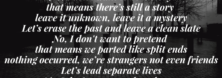 Let’s be strangers and forget our past No, I don’t want to be history that means there’s still a story leave it unknown, leave it a mystery Let’s erase the past and leave a clean slate No, I don't want to pretend that means we parted like split ends nothing occurred, we’re strangers not even… Continue reading Strangers
