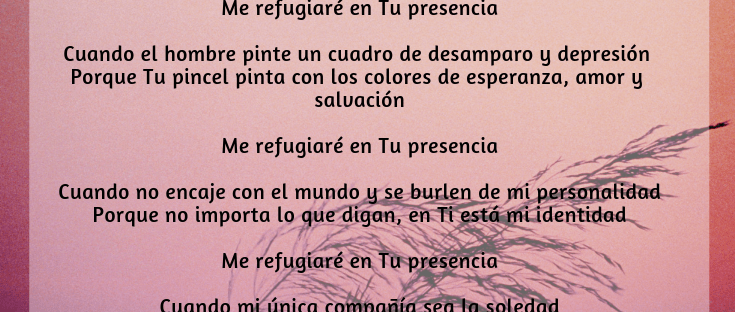 Me refugiaré en Tu presencia Cuando sienta que ya no puedo dar un paso más Ni para adelante, ni para atrás. Me refugiaré en Tu presencia Cuando mis problemas se conviertan en tormentas Y me ahogue en sus aguas turbulentas. Me refugiaré en Tu presencia Cuando los lagos de mis ojos estén llenos de lágrimas… Continue reading Mi Refugio: Tu Presencia