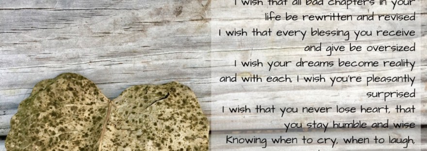 I wish every day you have an excuse to smile as bright as the sunrise I wish opportunities rain down on you, that heaven will open its skies I wish that love surrounds you from the open to the close of your eyes I wish that any harm coming to you will turn around or… Continue reading I Wish