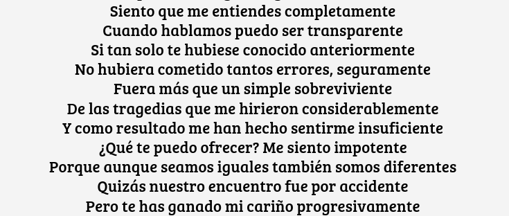 Tú y yo somos tan iguales y a la vez diferentes Y aunque te lleve presente En mi corazón y en mi mente Tú siempre estás lejos en otro ambiente Trato de actuar indiferente No permitiéndole a la gente Que vea mi corazón, pero en mis ojos es evidente Que aunque seamos iguales y a… Continue reading Iguales Pero Diferentes