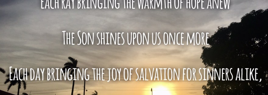 Rise and Shine! The sun shines upon us once more Each ray bringing the warmth of hope anew The Son shines upon us once more Each day bringing the joy of salvation for sinners alike, for me and you Arise, shine, for your light has come, and the glory of the Lord has risen upon you. (Isaiah 60:1 ESV)… Continue reading Son-rise
