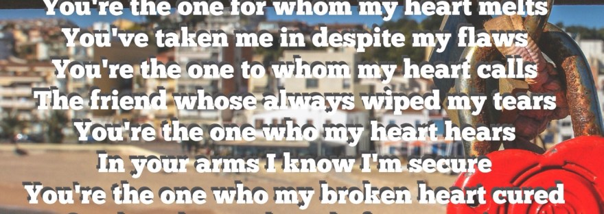 "You're The One" Before anything, I loved you first You're the one for whom my heart thirsts I met you before I knew anyone else You're the one for whom my heart melts You've taken me in despite my flaws You're the one to whom my heart calls The friend whose always wiped my tears… Continue reading You’re The One