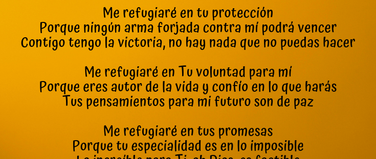 Me refugiaré en Tus palabras Porque ellas no pasarán Abren caminos, y mis pasos iluminarán Me refugiaré en Tu cobertura Porque en Ti mi vida está segura Contigo veré la mañana de la noche oscura Me refugiaré en Tu gracia Porque es más que suficiente para mí Pongo mi fe completamente en Ti Me refugiaré… Continue reading Mi Refugio: Tus Palabras